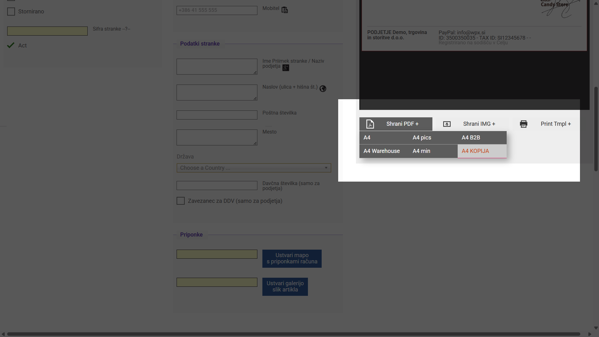 Prej ste imeli na obrazcu naročila več gumbov za tiskanje računov (default A4; B2B z netto zneski; S slikami artiklov...).