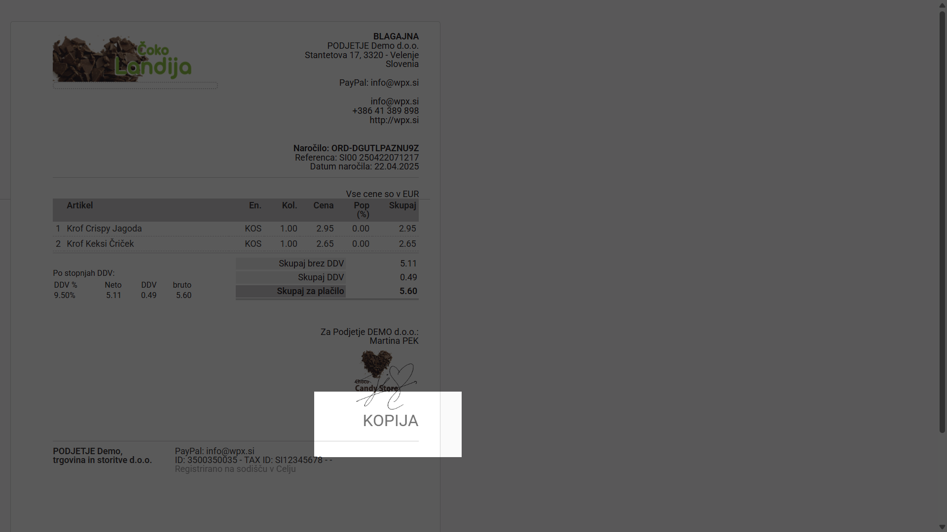 Občasno davčni inšpektor pričakuje, da boste po prvem tisku vse nadaljnje račune tiskali ali pošiljali naprej kot "kopije originala", kjer je oznaka KOPIJA jasno vidna.