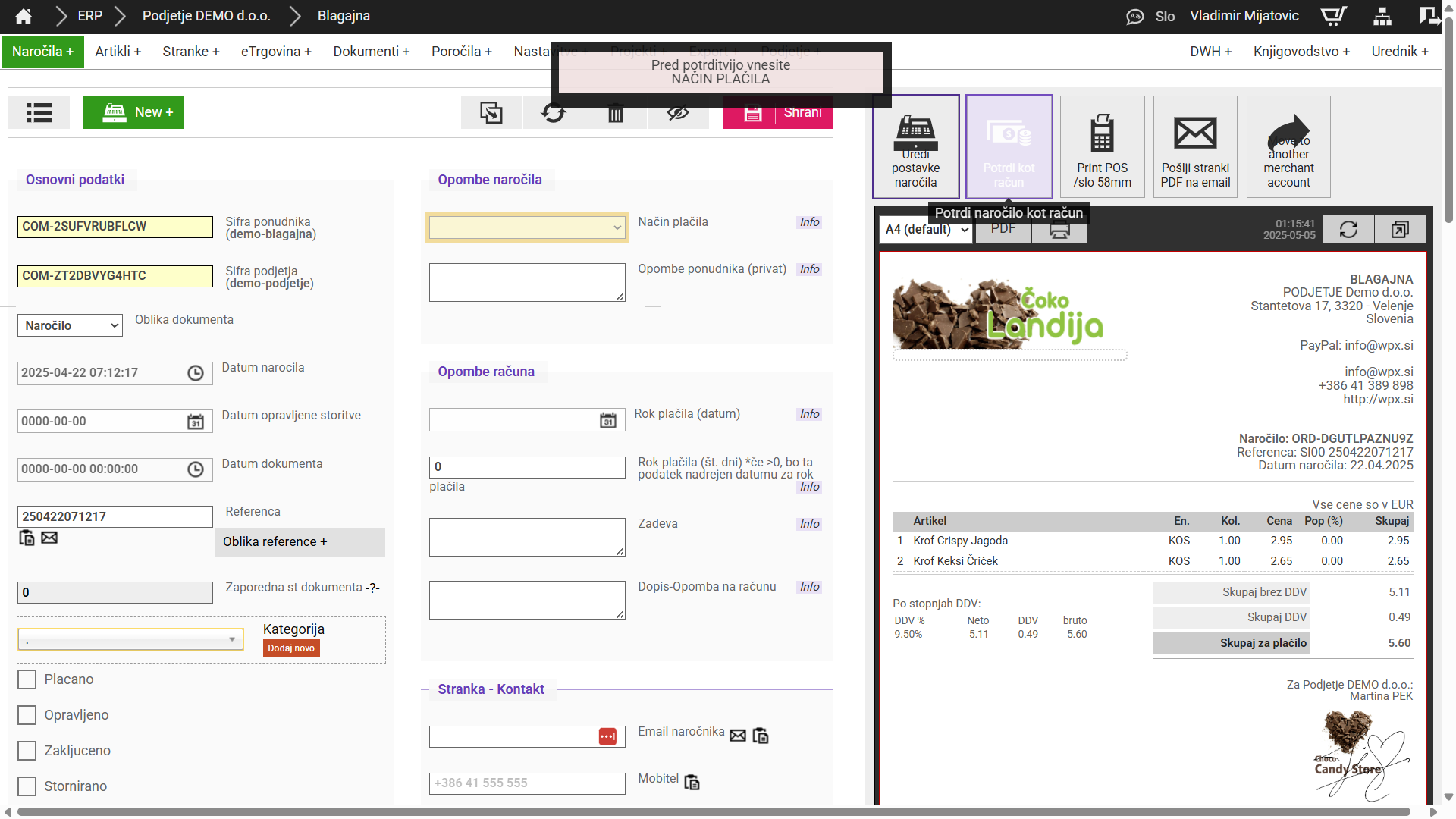 - "Potrdi kot zaključen račun" ... blagajna računu doda naslednjo zaporedno št. računa, novo referenco in naročilo označi kot Plačano + Opravljeno + Zaključeno.